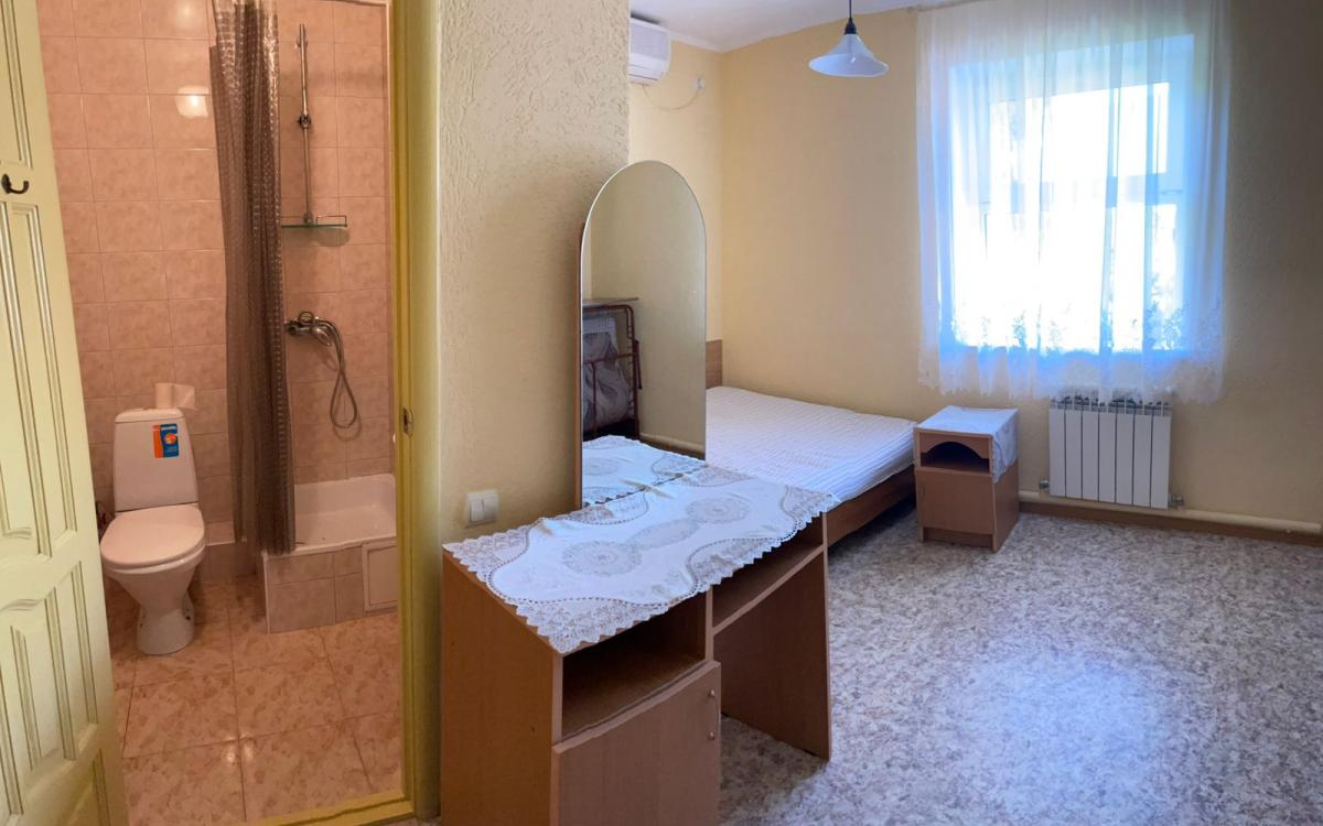 - 2-3-х местный номер со всеми удобствами: небольшие по площади , в номере односпальные или двуспальная кровати, шкаф, стулья, прикроватные тумбочки, стол, зеркало, кондиционер, телевизор, санузел с душевой кабиной. Холодильник в номере или рядом у входа. Возможно дополнительное место под запрос. Есть одноместное размещение.