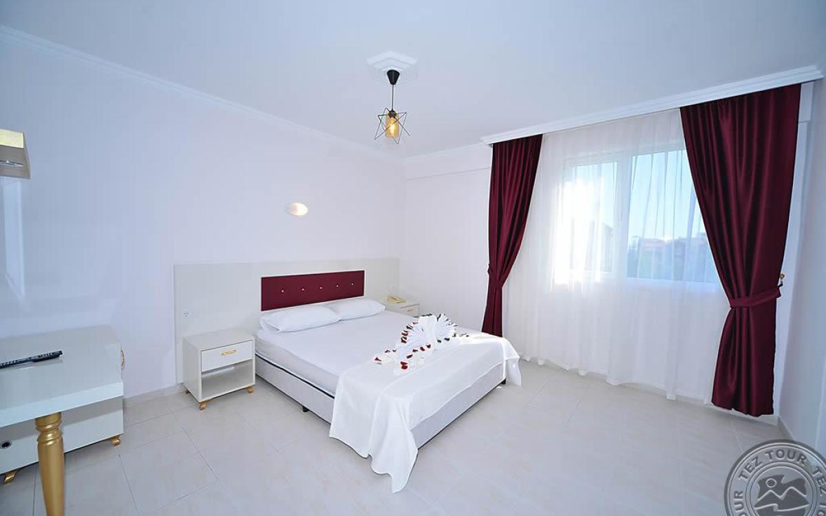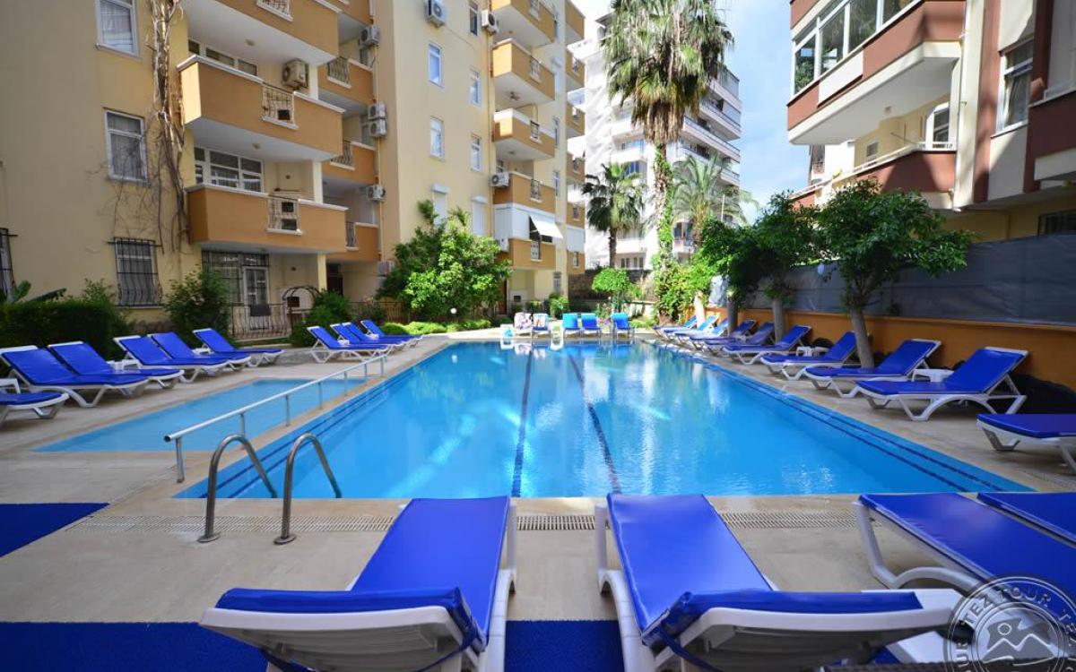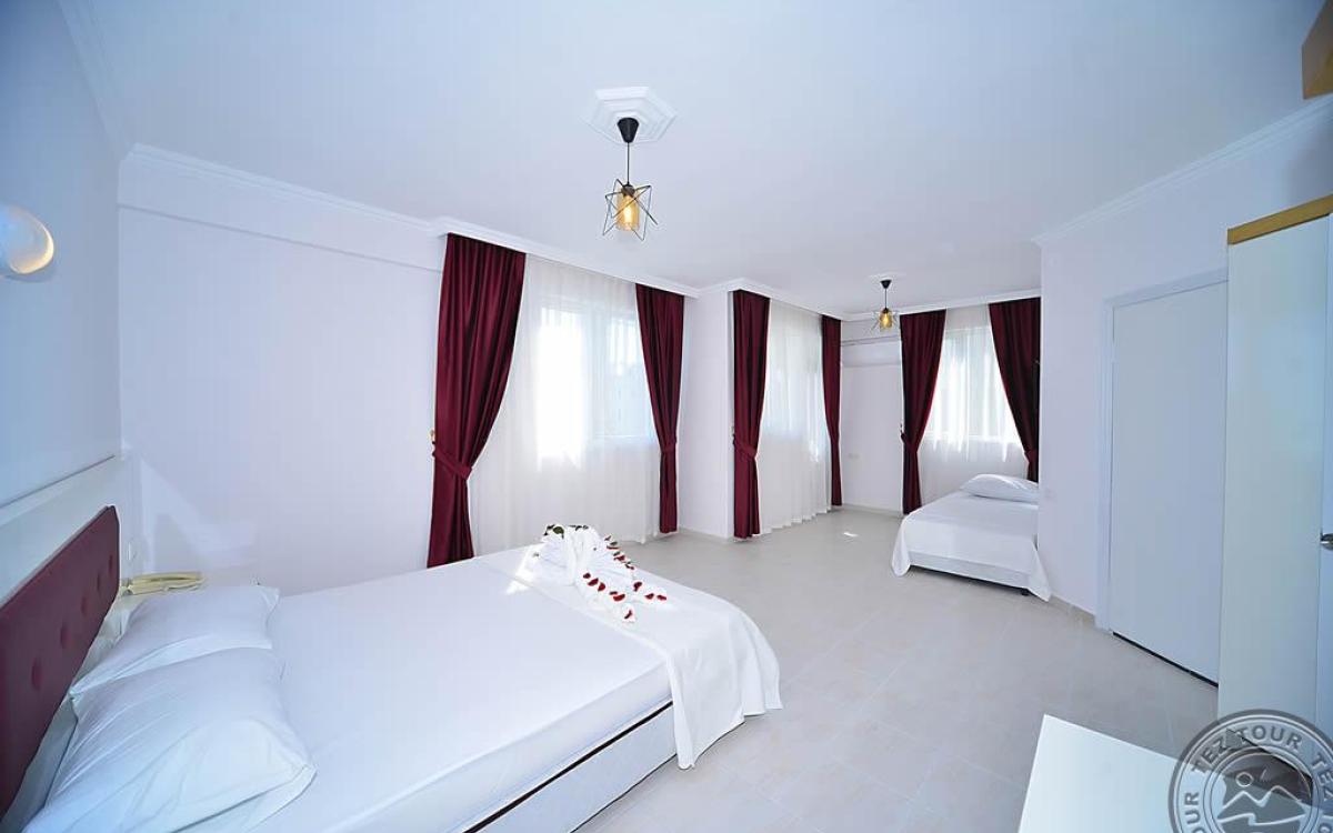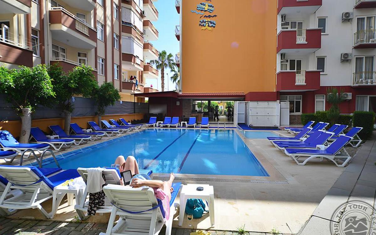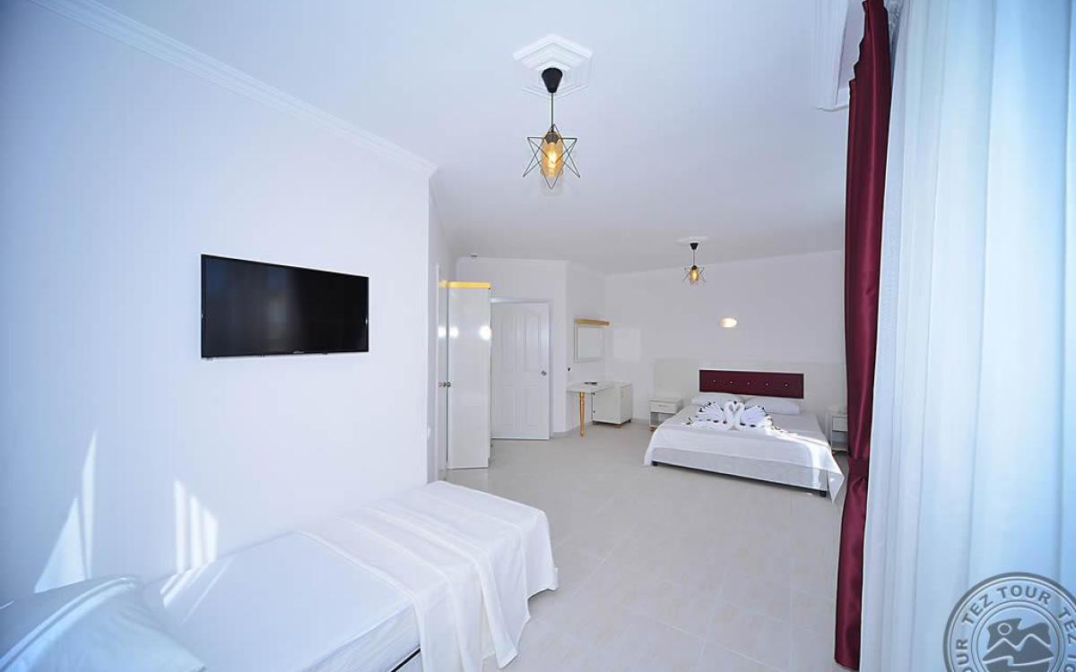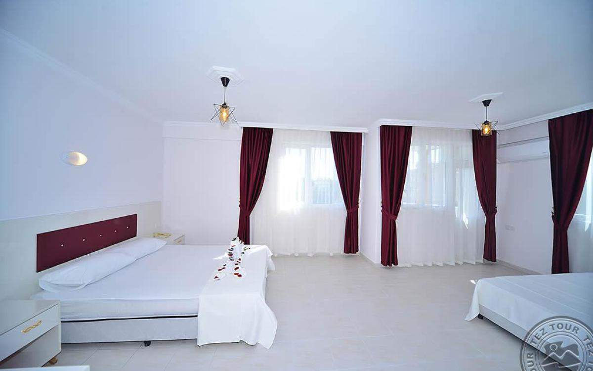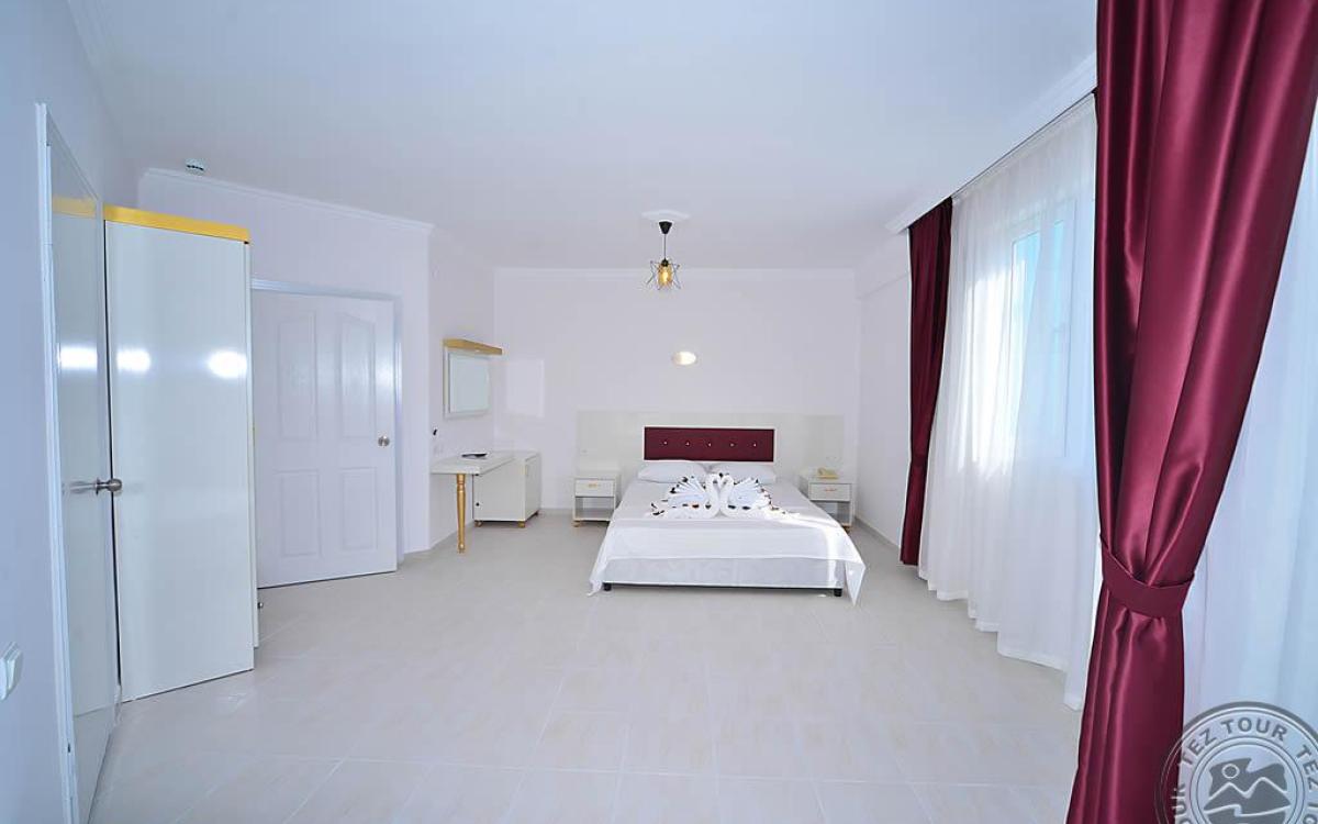 в 140 км от аэропорта г. Анталья, в 6 км от центра г. Аланья, в 150 м через дорогу от собственного пляжа.