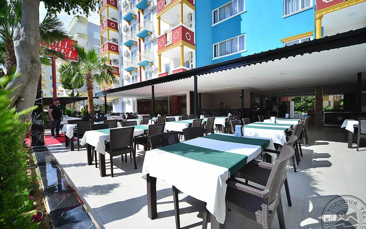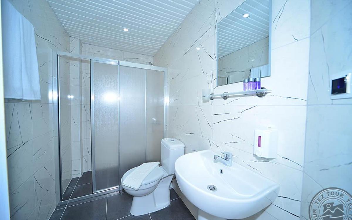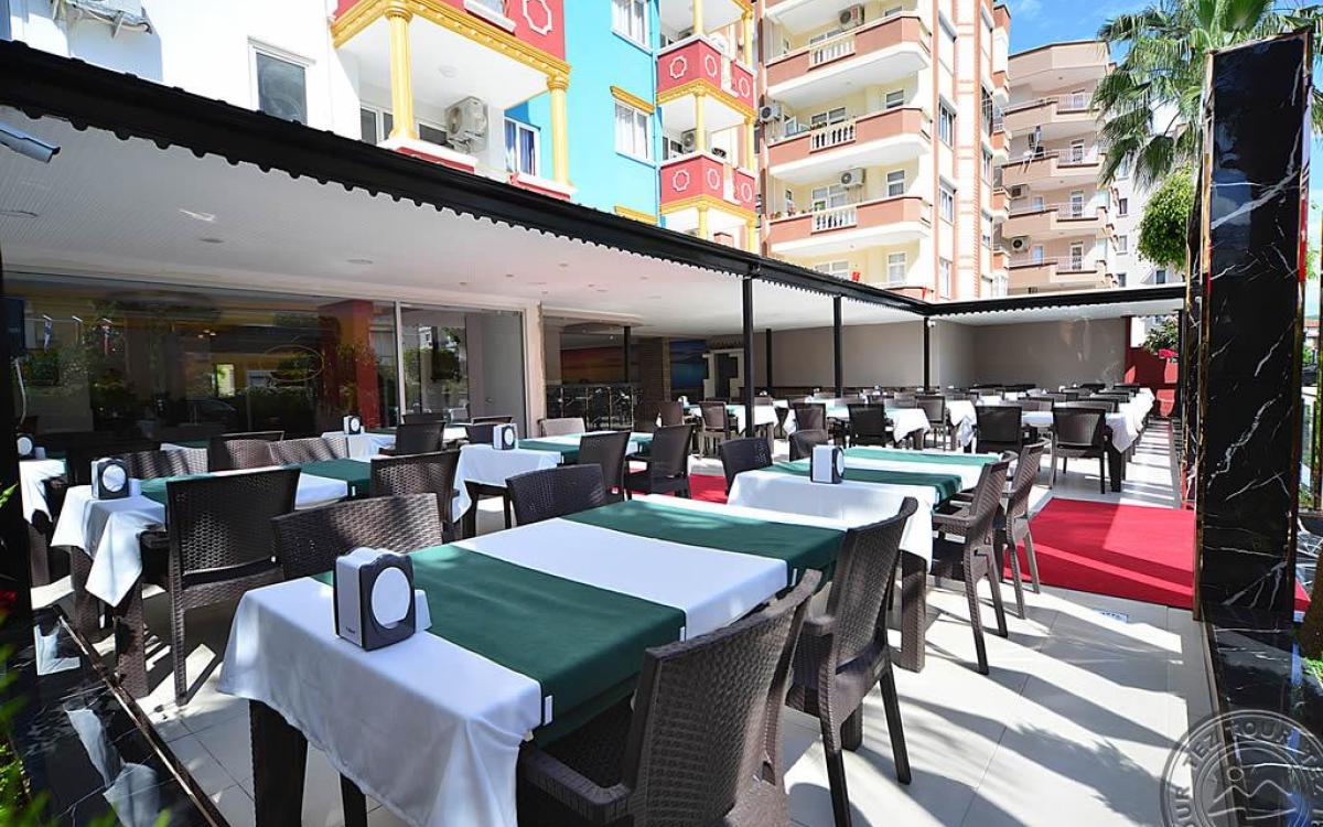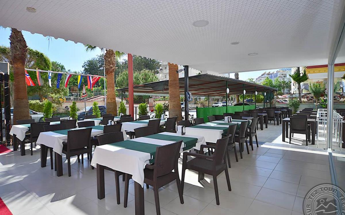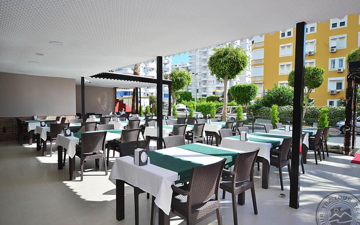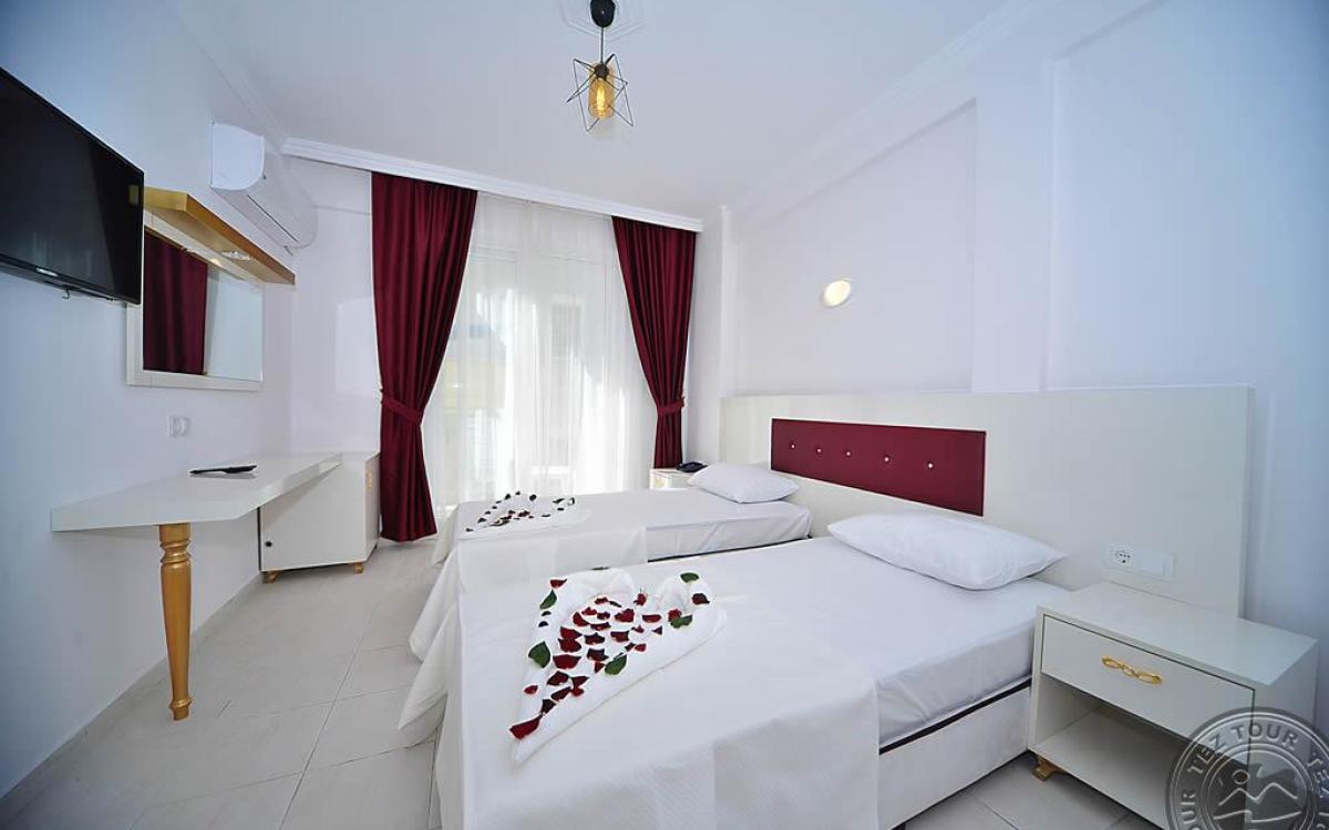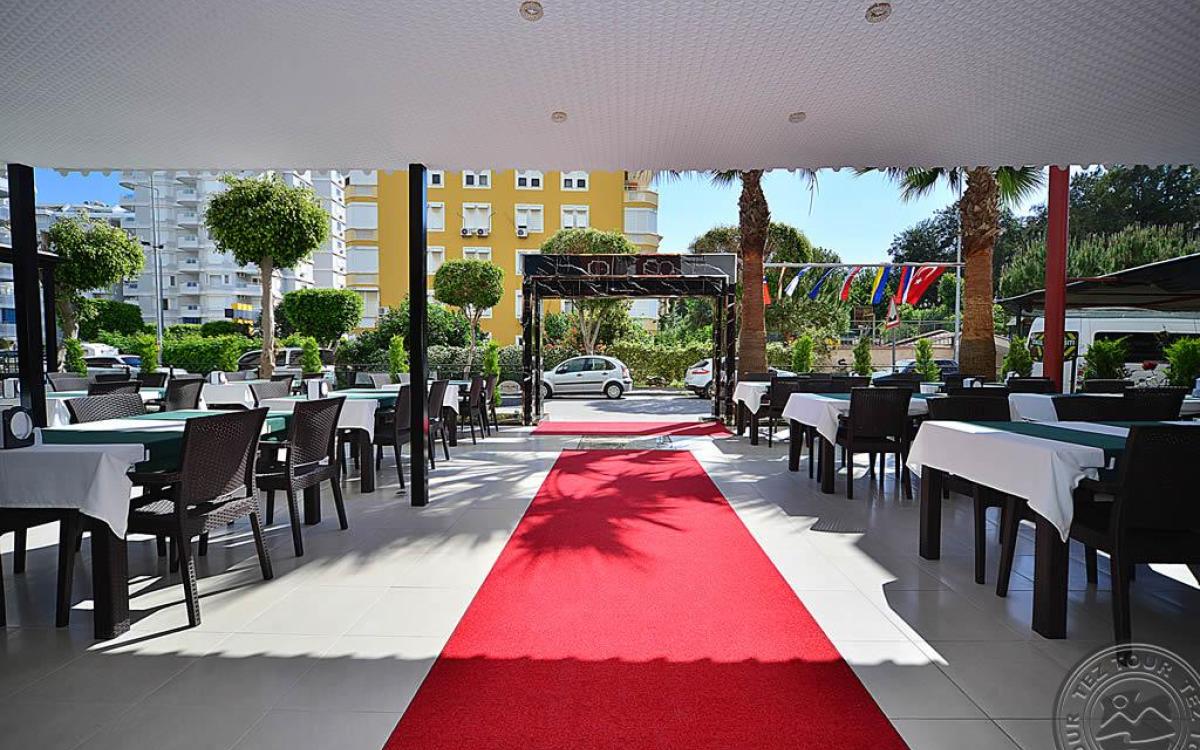 в 140 км от аэропорта г. Анталья, в 6 км от центра г. Аланья, в 150 м через дорогу от собственного пляжа.