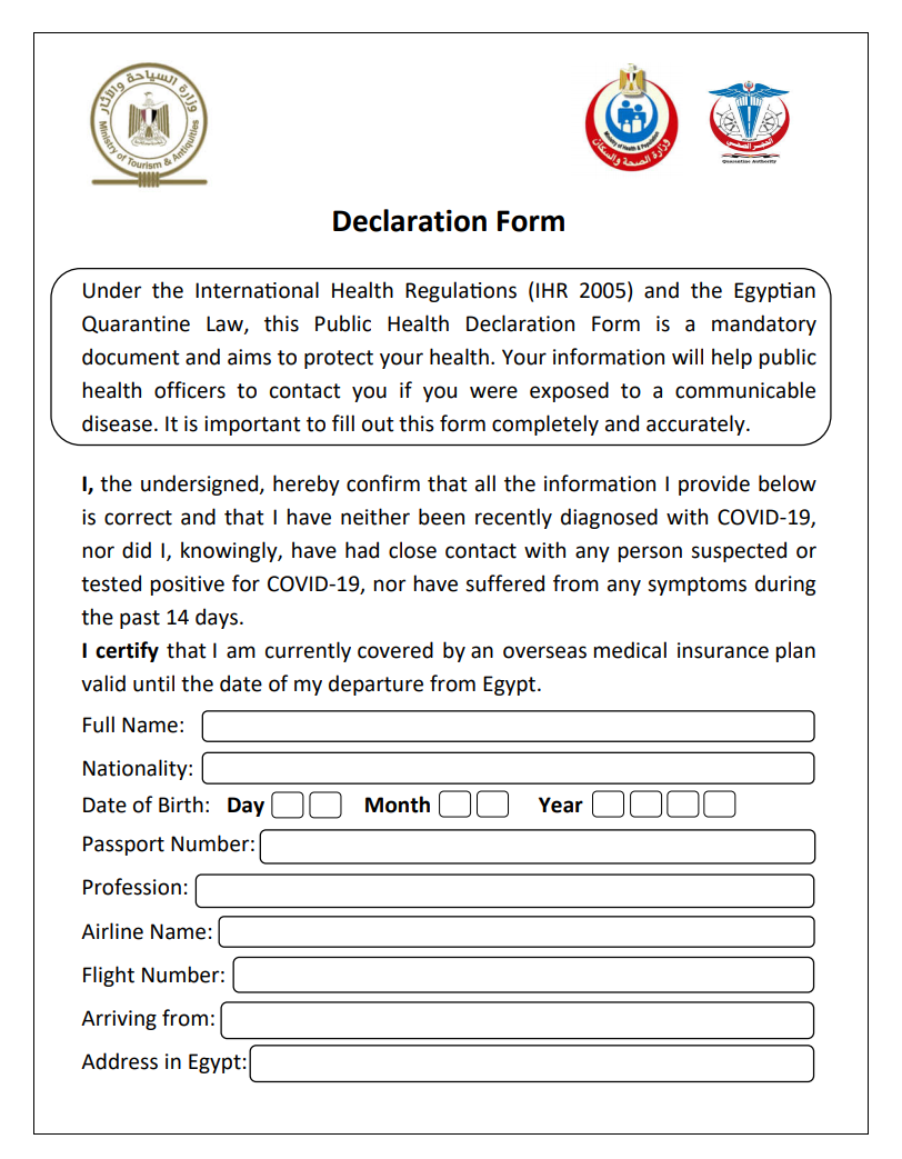 Перед посадкой в самолёт каждому пассажиру нужно заполнить "Декларацию путешественника". Заполнение производится на английском или арабском языке. В данной декларации указывается отсутствие (наличие) признаков вирусных заболеваний. По прилёту в аэропорт в Египет "Декларации путешественников" сдаются в соответствующие службы.