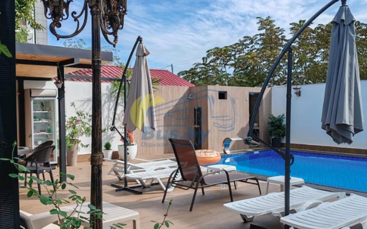 С 2024 года в гостевом доме открылся собственный бассейн. Возле бассейна шезлонги, зонты.