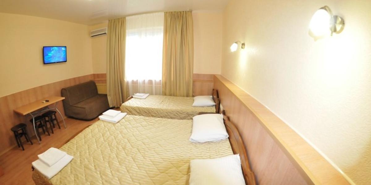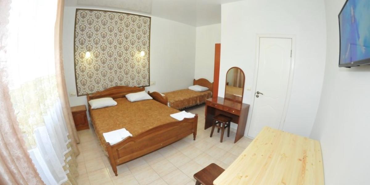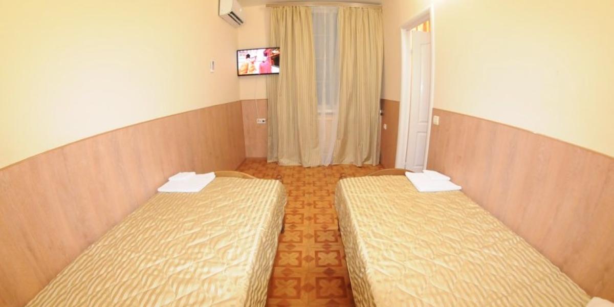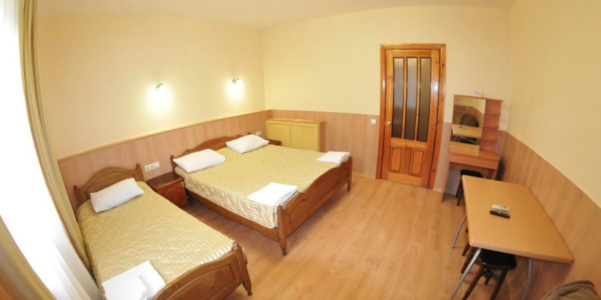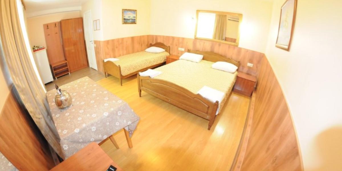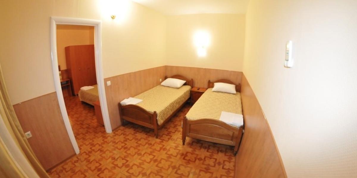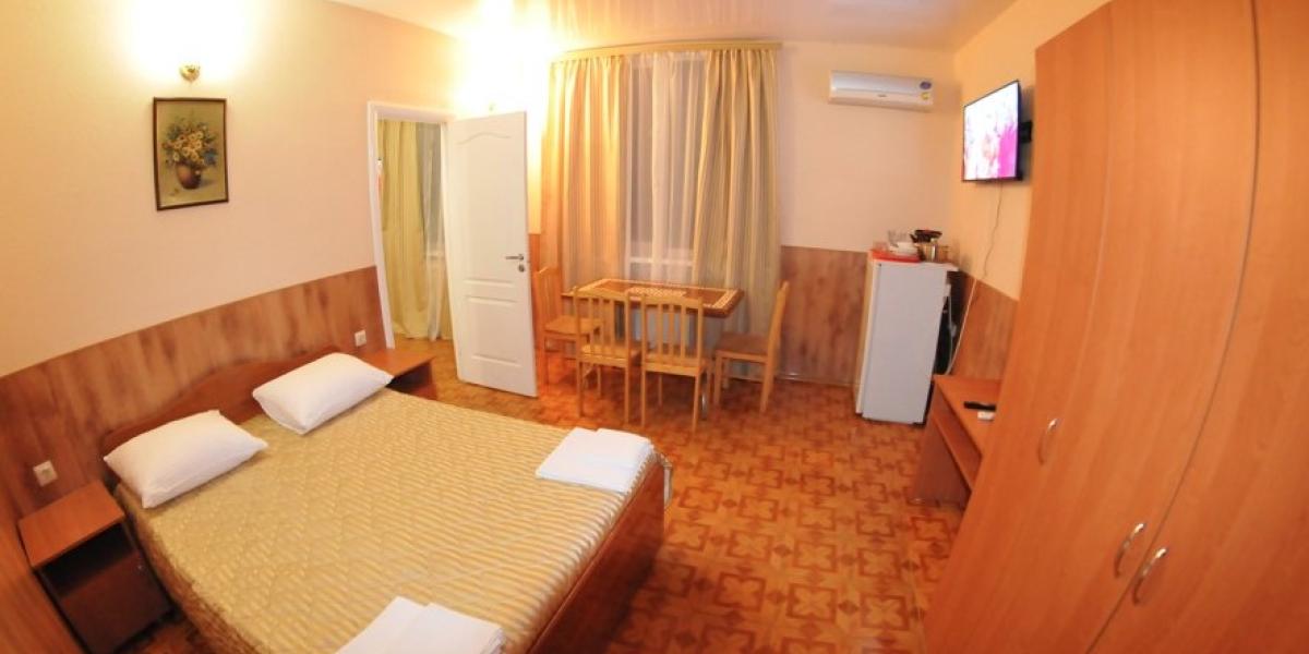ПРОЖИВАНИЕ: — в 2-х,3-х, местных и семейный люкс двухкомнатный 4-х местный со всеми удобствами. В каждом номере односпальные или двуспальная кровати, шкаф, стулья, прикроватные тумбочки, стол, сплит-система, телевизор, холодильник, санузел.
