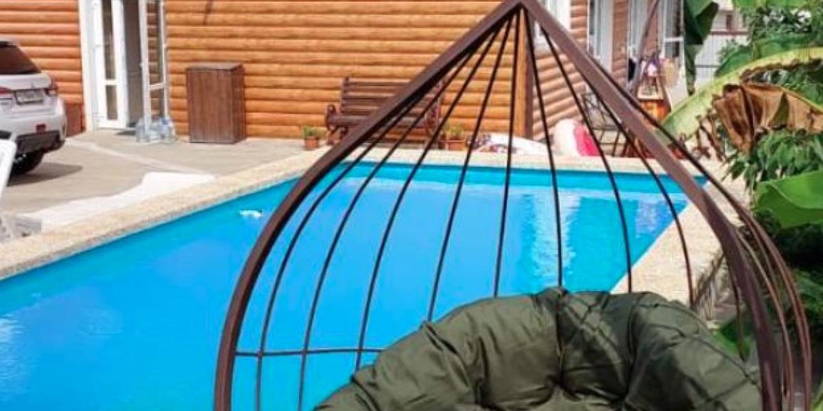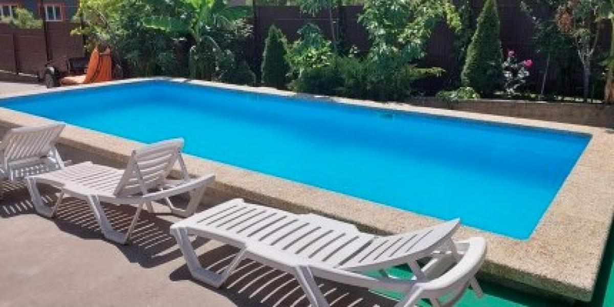 Бассейн под открытым небом с современной очисткой воды. Благоустроенный внутренний двор: беседки, шезлонги, столы, стулья, батут, детская площадка.