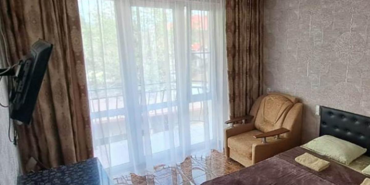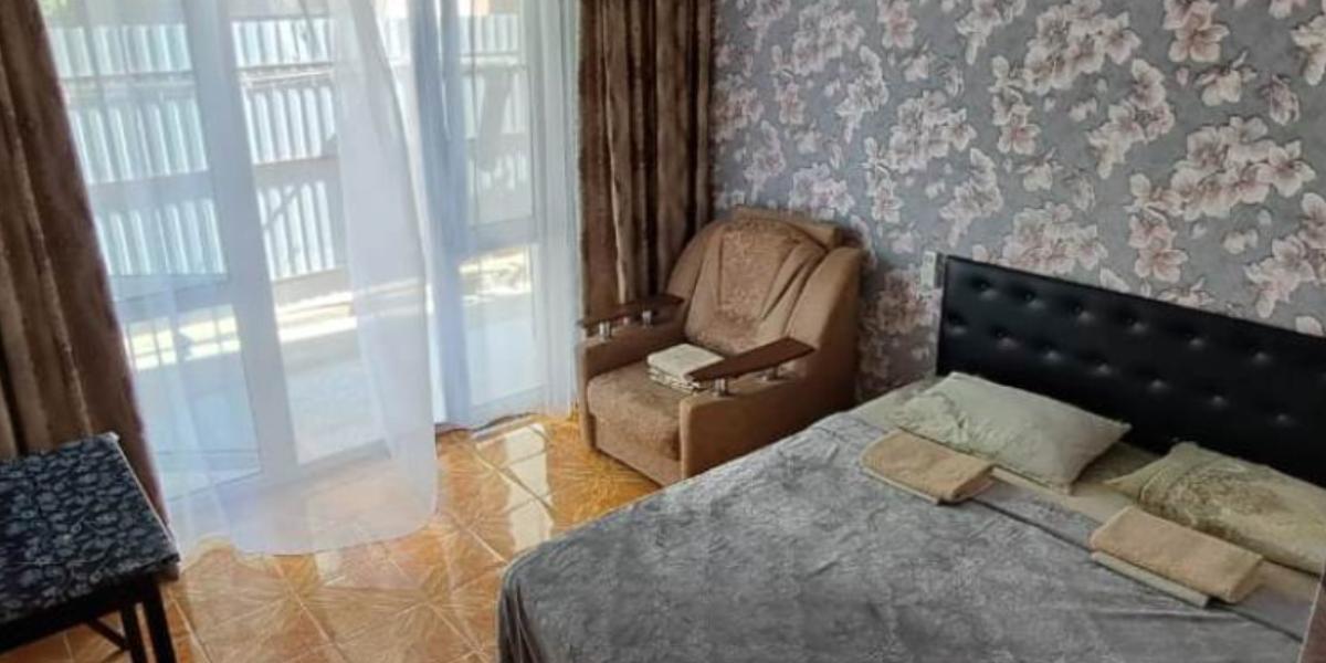 2-3-х местные номера со всеми удобствами: санузел в номере, кондиционер, телевизор, холодильник, двуспальная кровать, кресло-кровать, шкаф, стулья, пуфики, прикроватные тумбочки, стол, вешалка, зеркало. Номера с балконами на 2-3 этаже, на 1-м этаже- выход во дворик, стоят стол и стулья для отдыха у каждого номера.