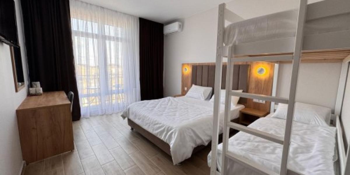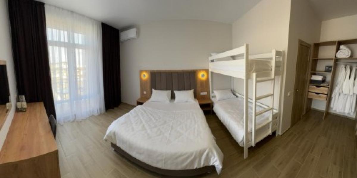 2-3-4-х местные номера с удобствами: санузел в номере, горячая и холодная вода постоянно, односпальные или двуспальная кровати (в 4-х местных номерах двуспальная+двухуровневые кровати), шкаф, стулья, прикроватные тумбочки, стол, зеркало, сплит-система, телевизор, холодильник. В каждом номере полотенца, фен, халат, тапочки, косметические принадлежности. БАЛКОН. 3-х и 4-х местные номера с видом на море, 2-х местные есть с видом на море и на город (уточнять при бронировании, вид на море-доплата). Возможно установка дополнительного места. Есть один номер двухкомнатный на 4-5 человек с кухней и видом на город. Расчет под запрос.