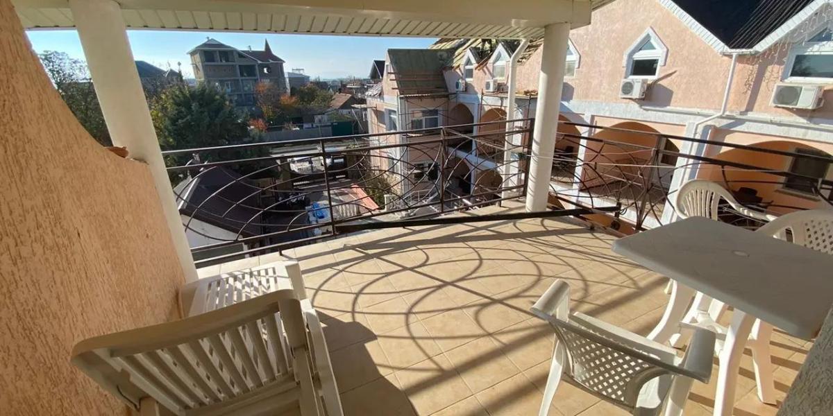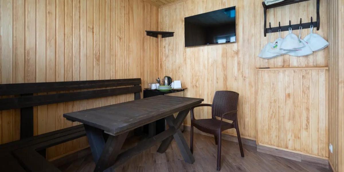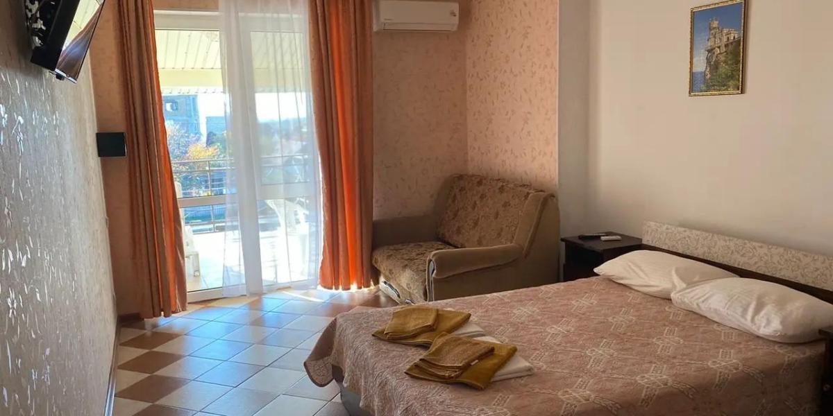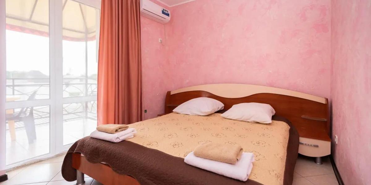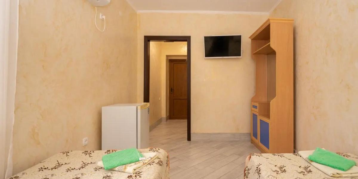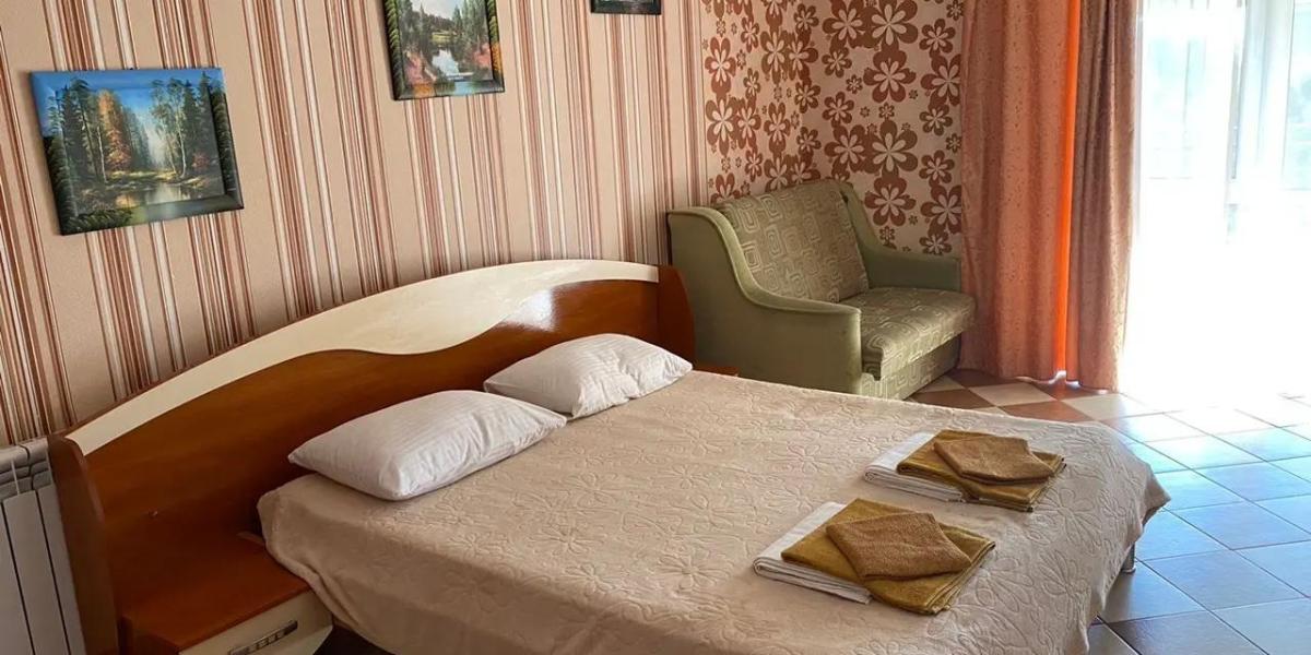 • 2х местный номер (1й, 2й этаж) – двуспальная или раздельные кровати, площадь номера – 15 м². Собственная терраса или балкон в зависимости от этажа. Допместо – кресло-кровать.