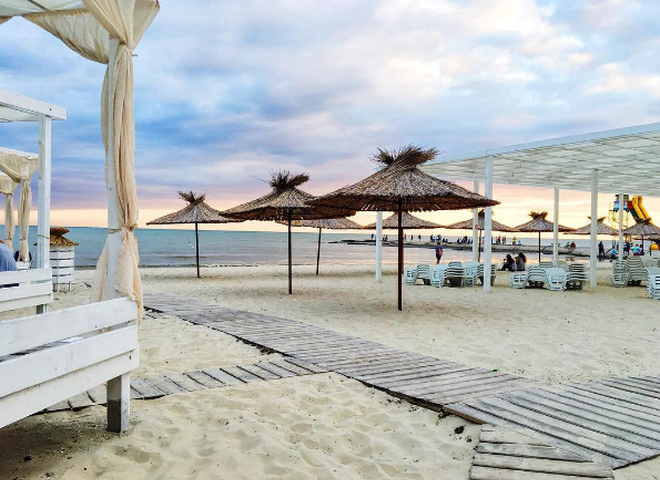 Климат в этого региона славится целебным воздухом, который смешивается с сухим степным и влажным морским, насыщенным йодом и бромом. По этой причине летний зной переносится легко. К минусам данного курорта можно отнести не совсем чистые пляжи. Это обусловлено тем, что во время шторма волнами на берег выбрасывается множество водорослей. А за счёт пологого входа в море здесь быстро прогревается вода, что является важной особенностью для отдыха с детьми.