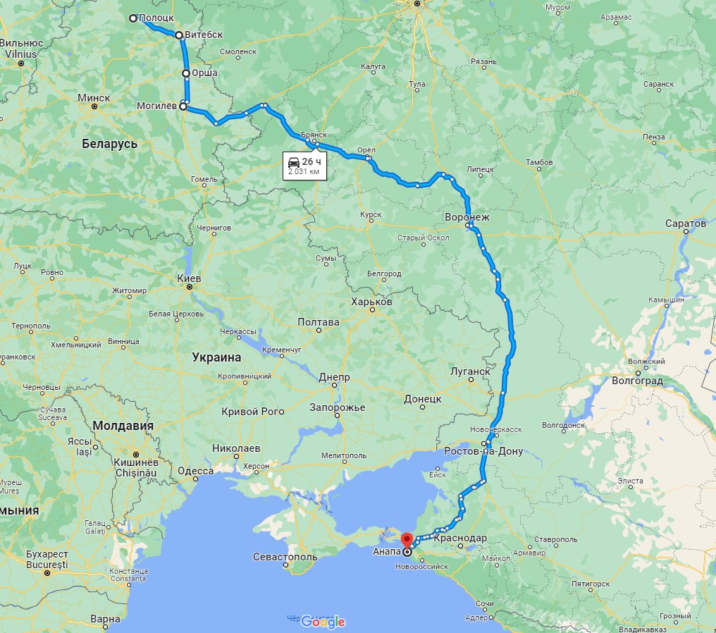 Маршрут из Могилева до Анапы проходит по территории Беларуси и России через следующие города: Могилев, Рославль, Брянск, Орел, Воронеж, Ростов-на-Дону, Краснодар, Анапа. Протяженность маршрута составляет более 2000 км.