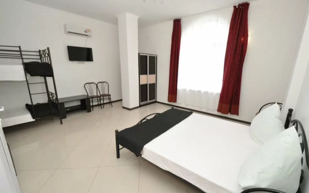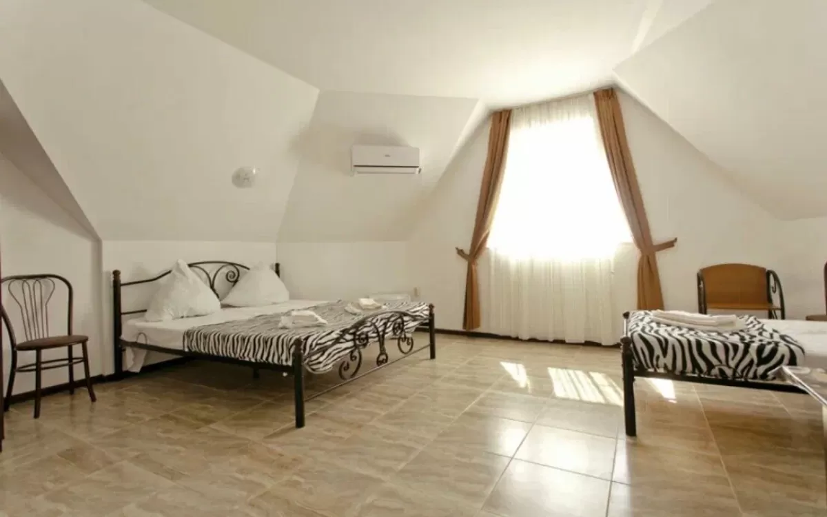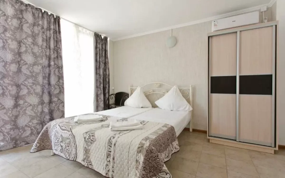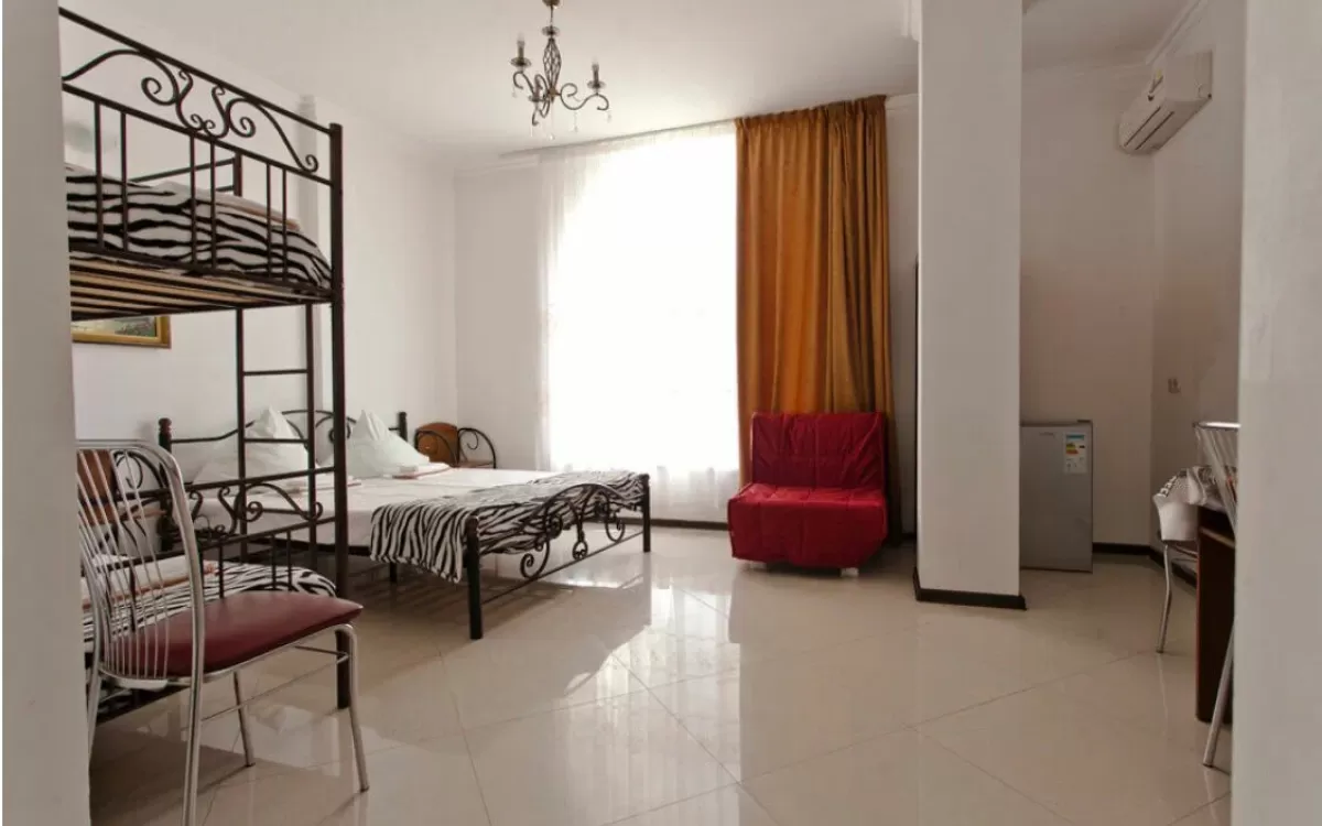 Однокомнатные 2-х , 3-х, 4-х и 5-ти местные номера со всеми удобствами: санузел в номере (горячая и холодная вода постоянно), полотенца, фен, кровати или раскладные диваны, шкаф, стулья, тумбочки, журнальный столик, вешалка, зеркало, кондиционер , холодильник, чайный набор посуды, телевизор с кабельным TV, WI-FI. Балкон не во всех номерах.