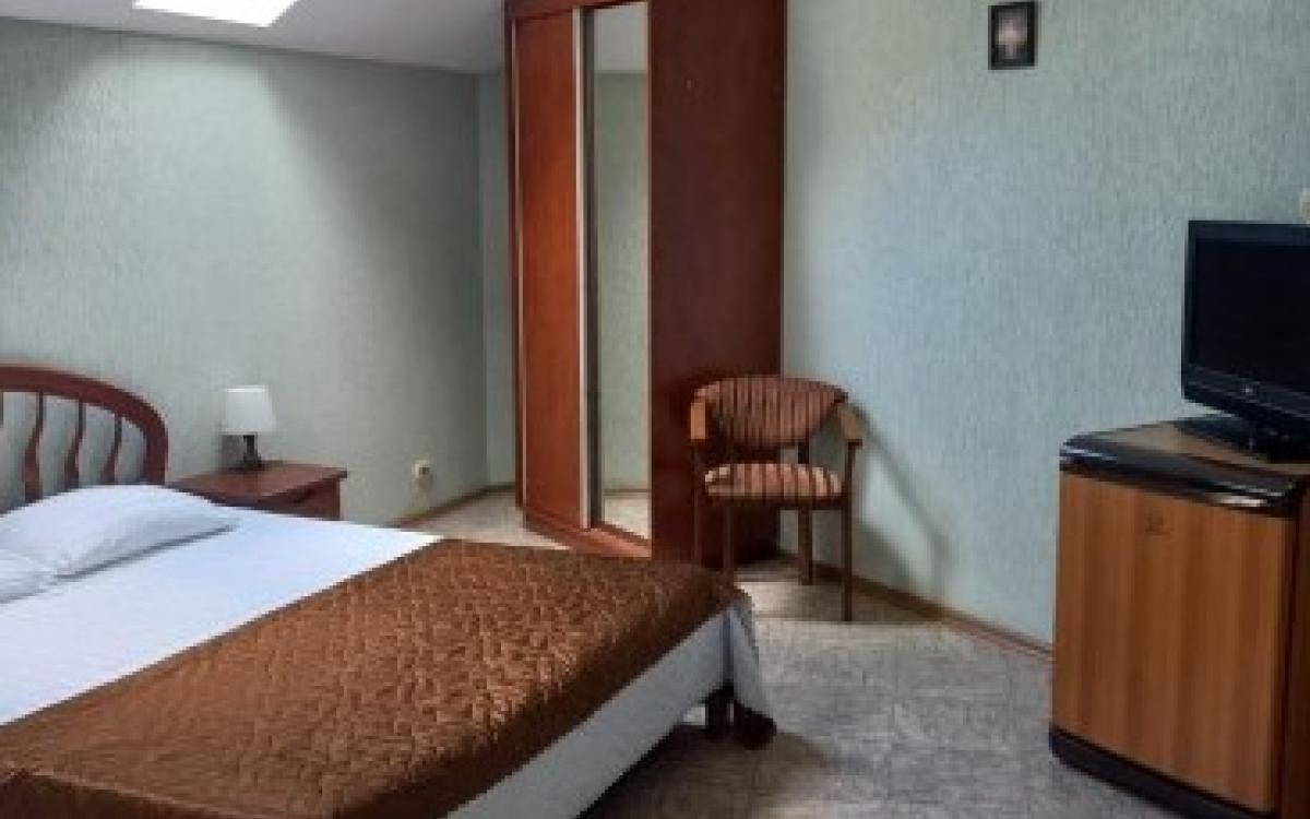 Люкс семейный пяти-шестиместный: 2 комнаты, 5-6 спальных мест (двуспальная кровать + 2 двуспальных дивана), площадь номера 55 кв. м., санузел- душ, туалет, биде, стиральная машина, собственная кухня, ТВ, сплит-система, холодильник, чайник, тапочки, полотенца для рук и тела, мыло жидкое и туалетная бумаг.