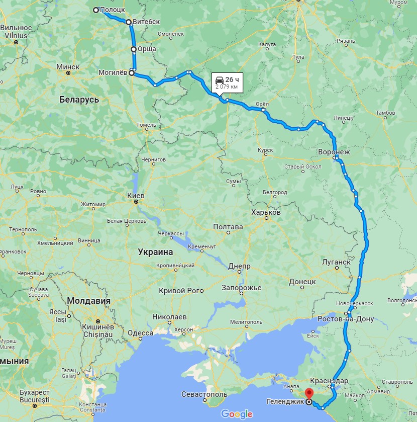Маршрут из Могилева до Геленджика проходит по территории Беларуси и России через следующие города: Орша, Могилев, Рославль, Брянск, Орел, Воронеж, Ростов-на-Дону, Краснодар, Геленджик. Протяженность маршрута составляет более 2000 км.