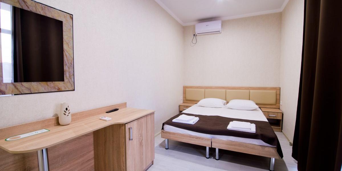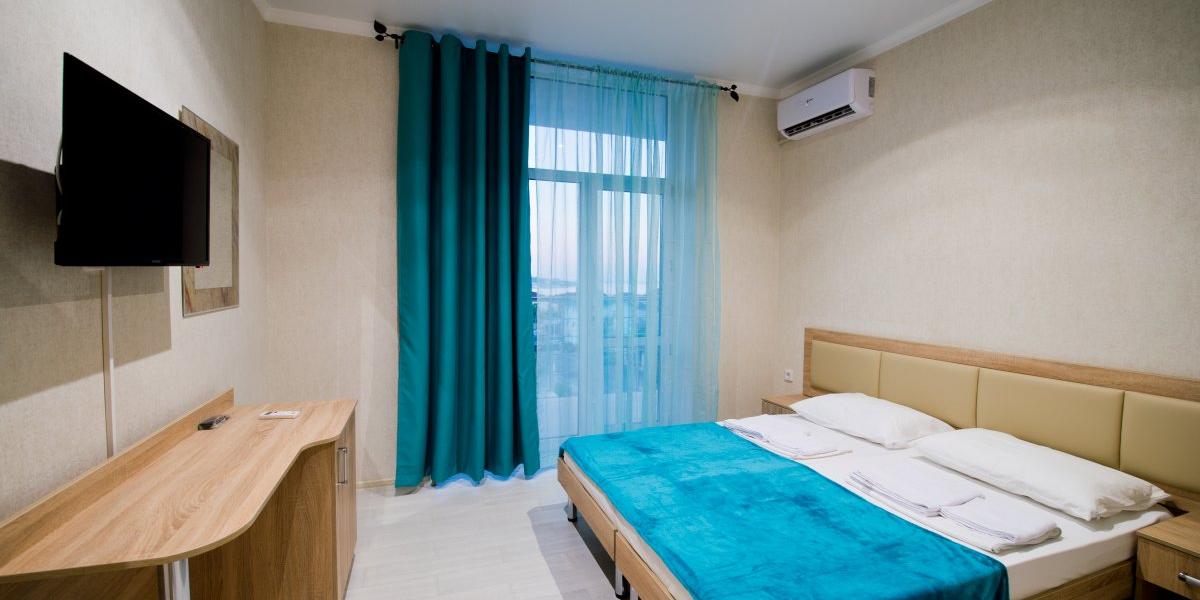 В номерах: две односпальные или одна двухспальная кровати (третье место-диван), прикроватные тумбочки, шкаф-купе с зеркалом, стол, стулья, ЖК-телевизор, холодильник, кондиционер, балкон.