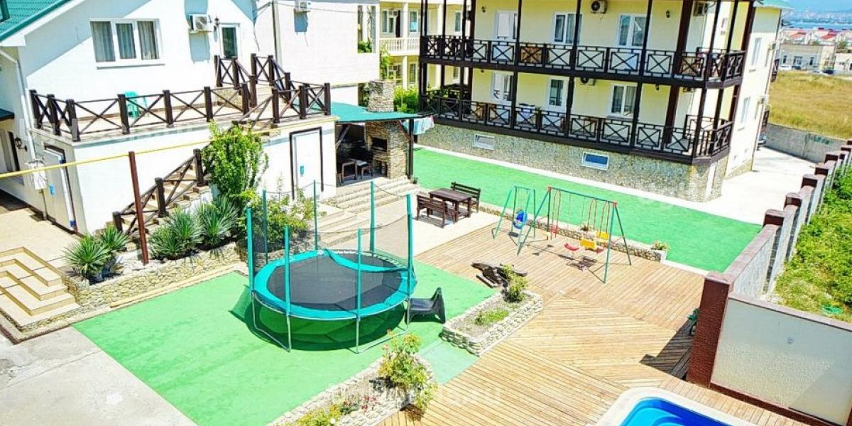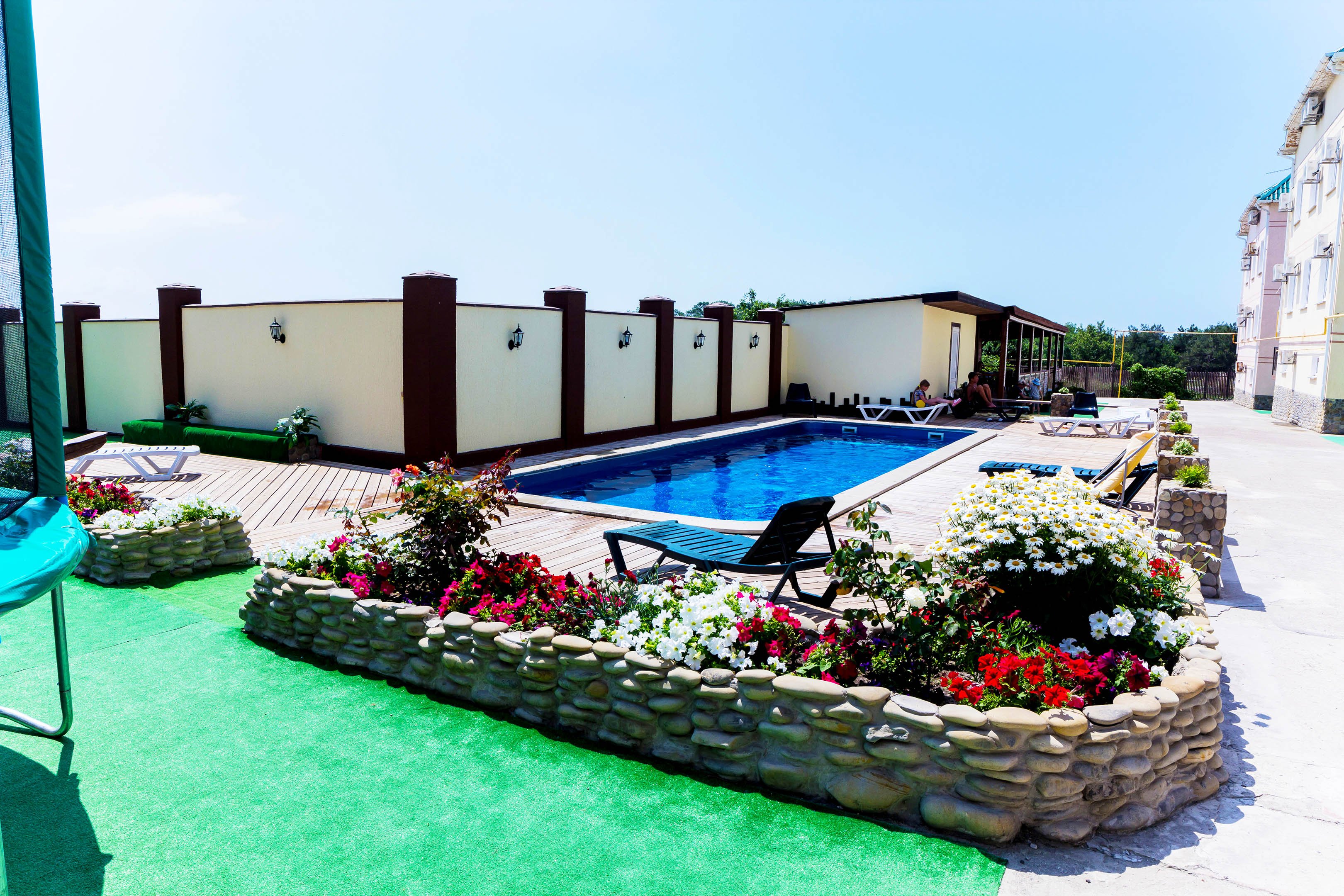 Бассейн под открытым небом 7/3м с современной очисткой воды. Благоустроенный внутренний двор: две беседки, шезлонги, столы, стулья, батут, качели, детская площадка.