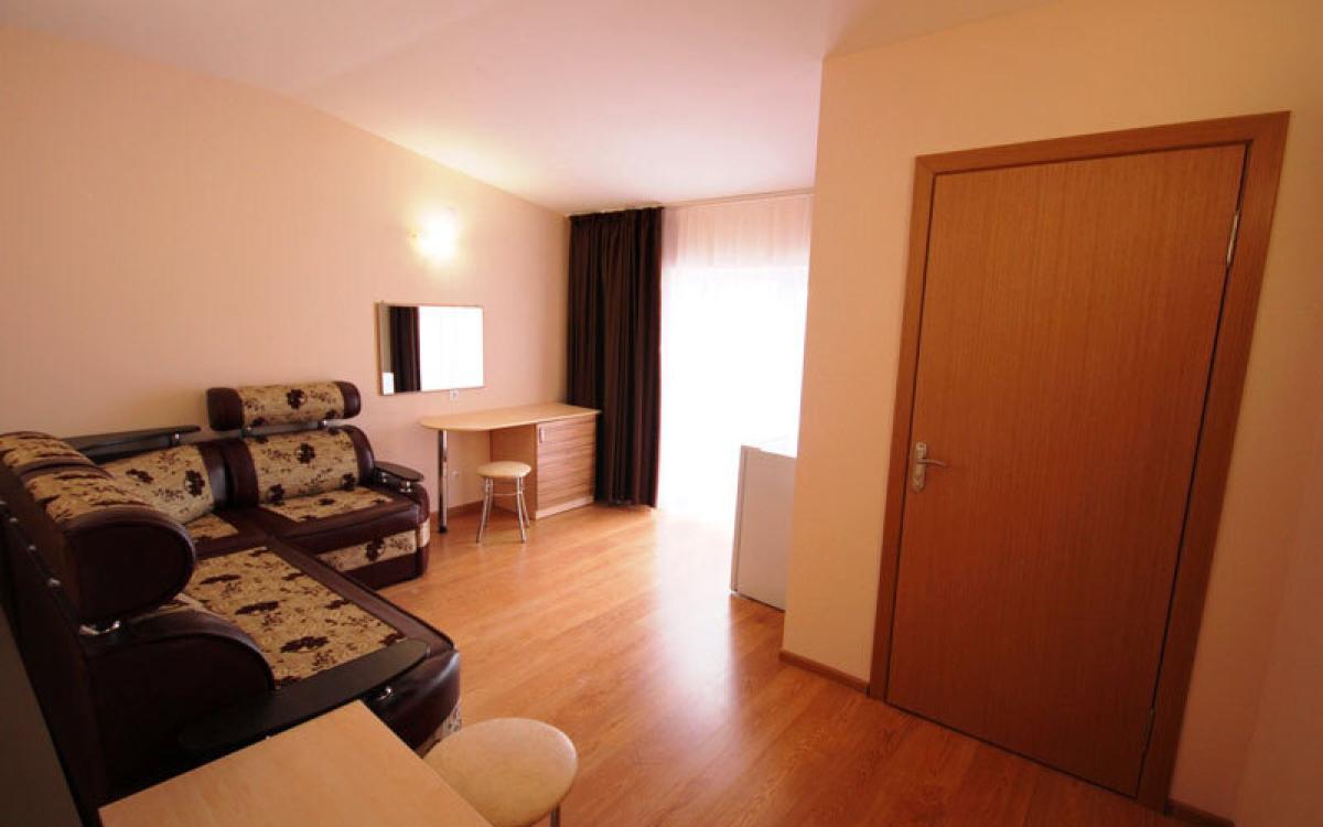 В номерах: мягкие и удобные кровати, шкаф, стулья, прикроватные тумбочки, журнальный столик, зеркало, кондиционер, телевизор, холодильник, посуда, балкон.